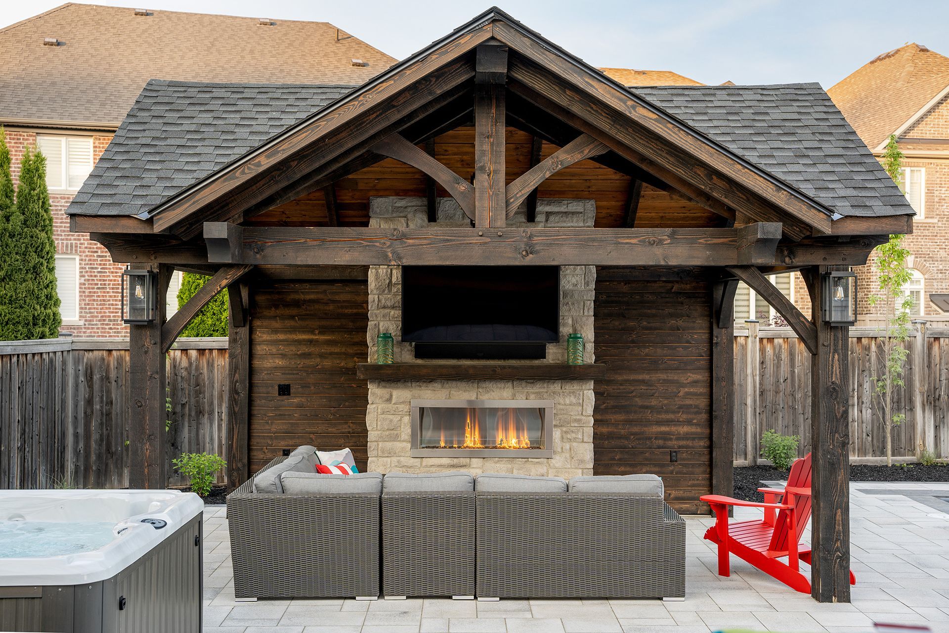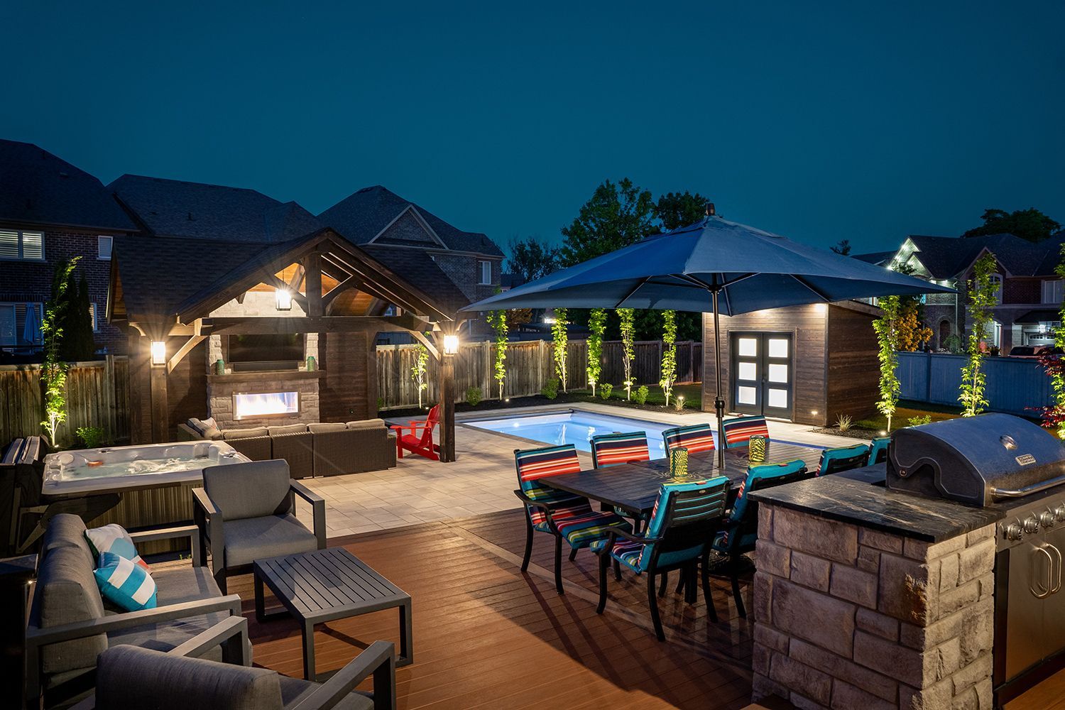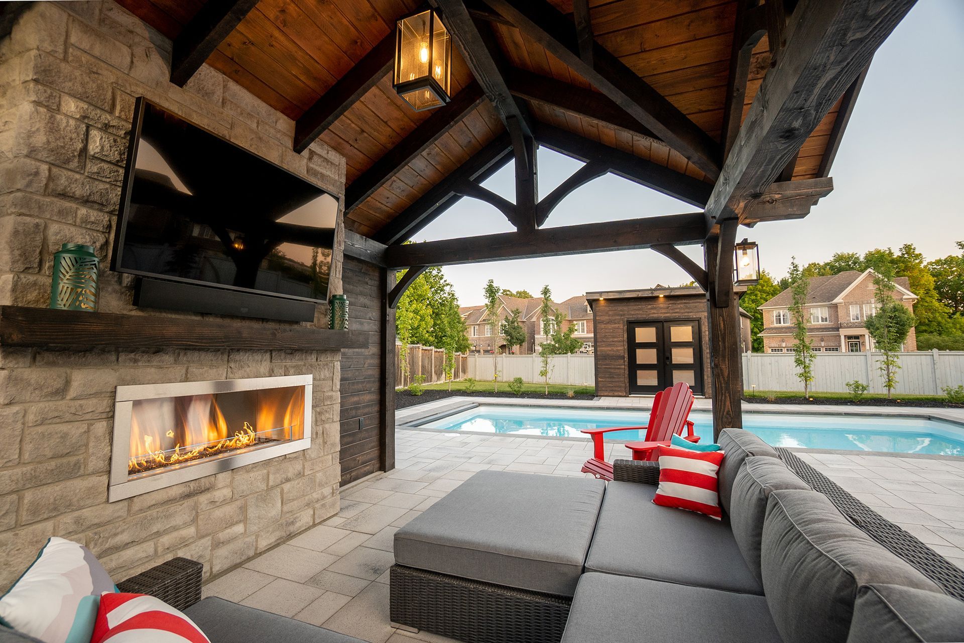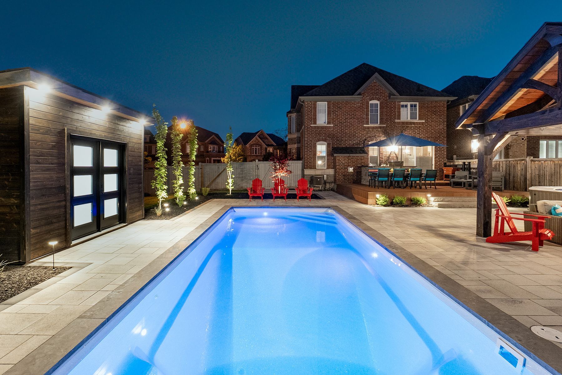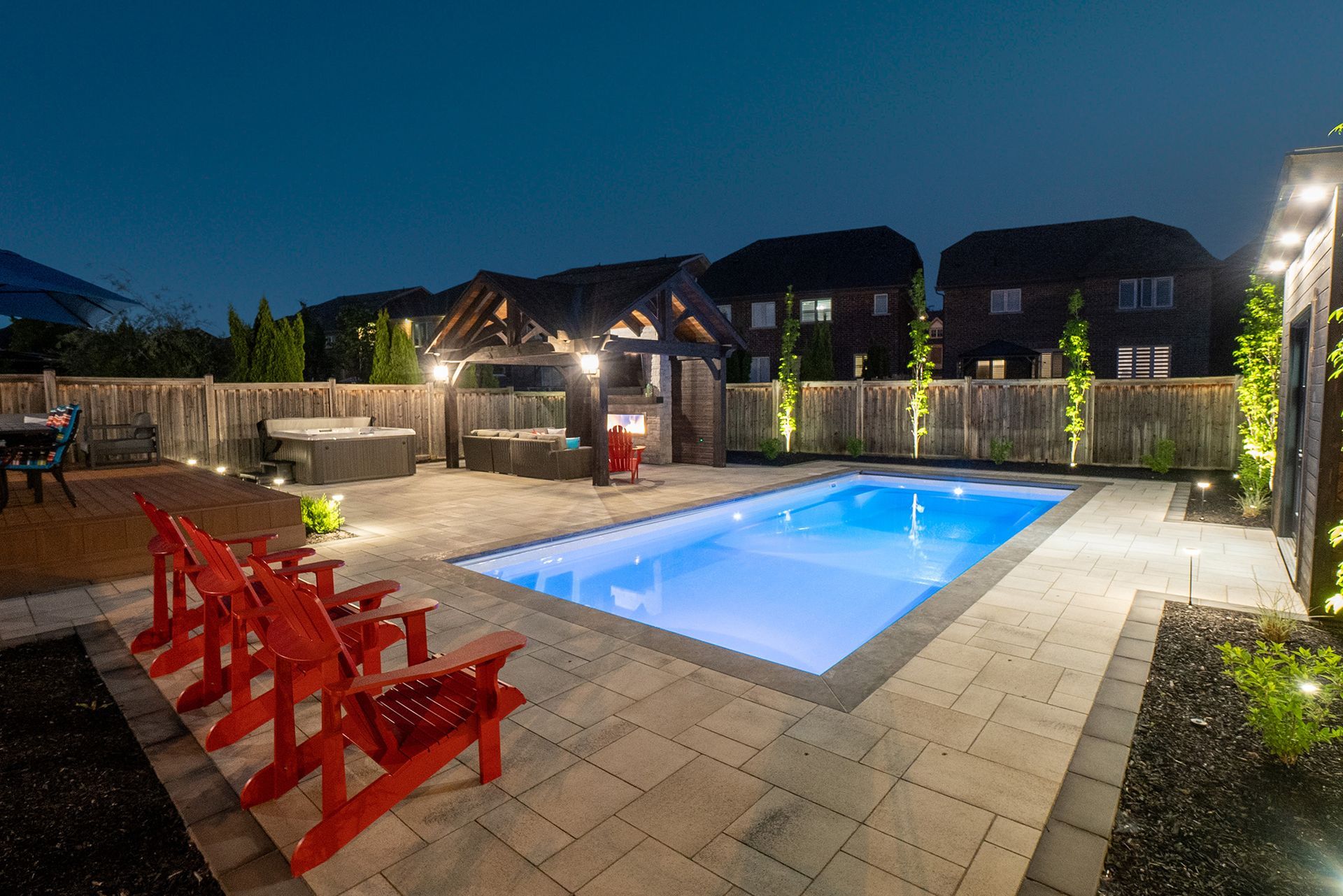 Welcome to this dream backyard retreat, where every detail has been meticulously crafted to elevate the outdoor living experience. Anchoring the space is an exquisite Latham Pool, boasting the sleek lines of the St. Thomas model (14 x 31) in the timeless hue of Pearl White. A custom timber pavilion stands as the focal point, offering warmth and ambiance with its inviting fireplace, while a built-in TV and outdoor audio system ensure entertainment aplenty. Adjacent to this gathering spot is a secondary custom shed structure, providing ample storage for all your outdoor essentials. Winding through the landscape are Unilock Umbriano patio and walkways, in the elegant tone of Winter Marble. Adding convenience and safety is the autocover, ensuring your pool is protected and ready for use at a moment's notice. As day turns to night, landscape lighting gracefully illuminates the surroundings, casting a soft glow on the lush softscape, comprised of carefully selected trees and plantings.