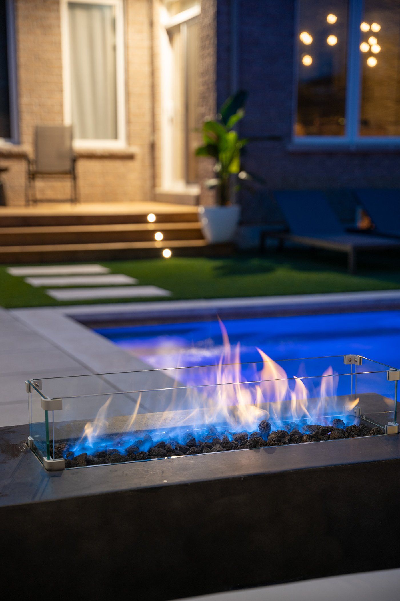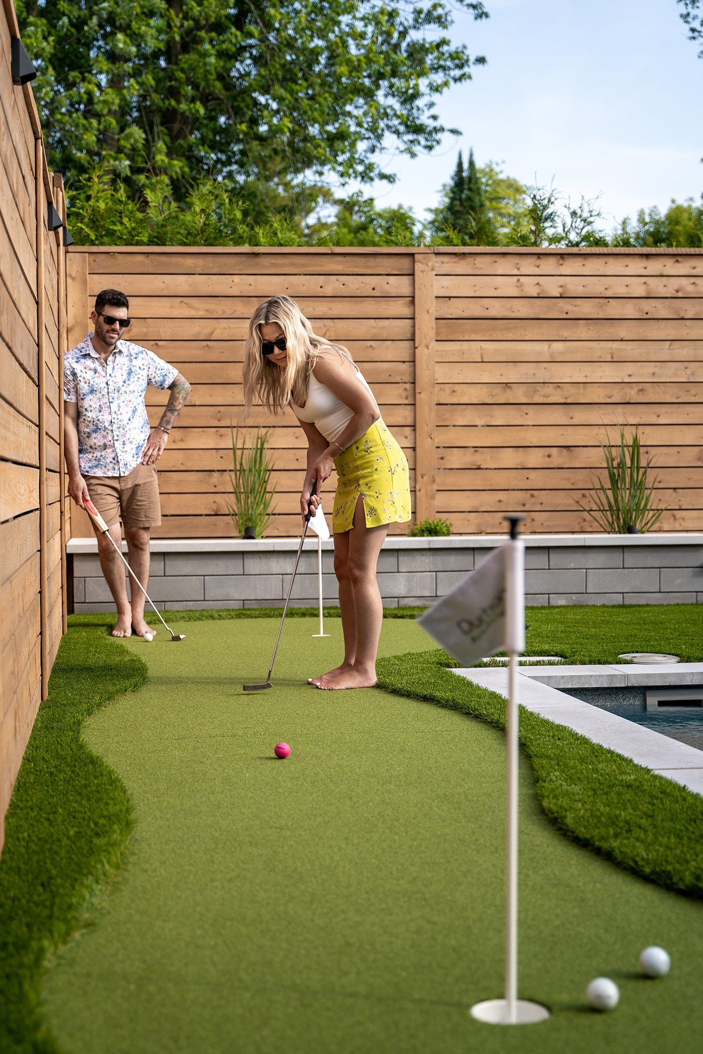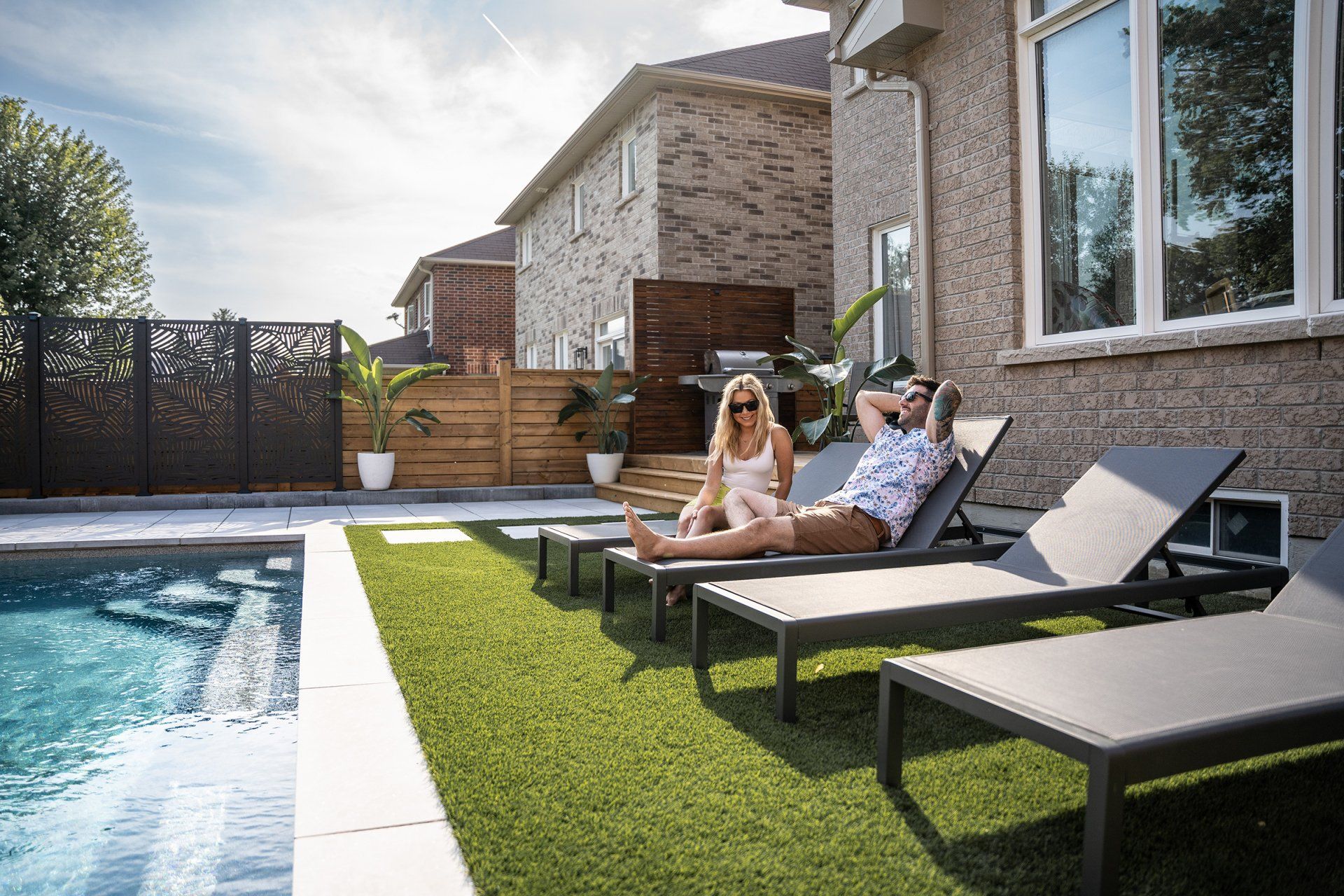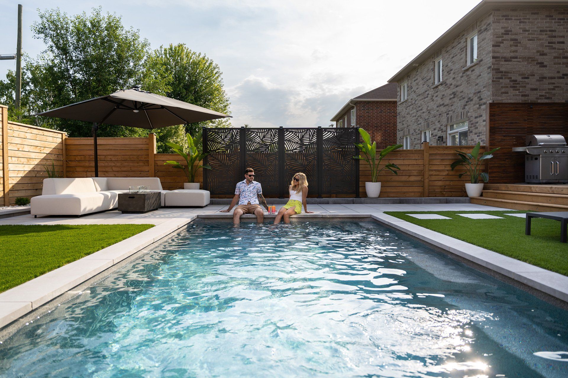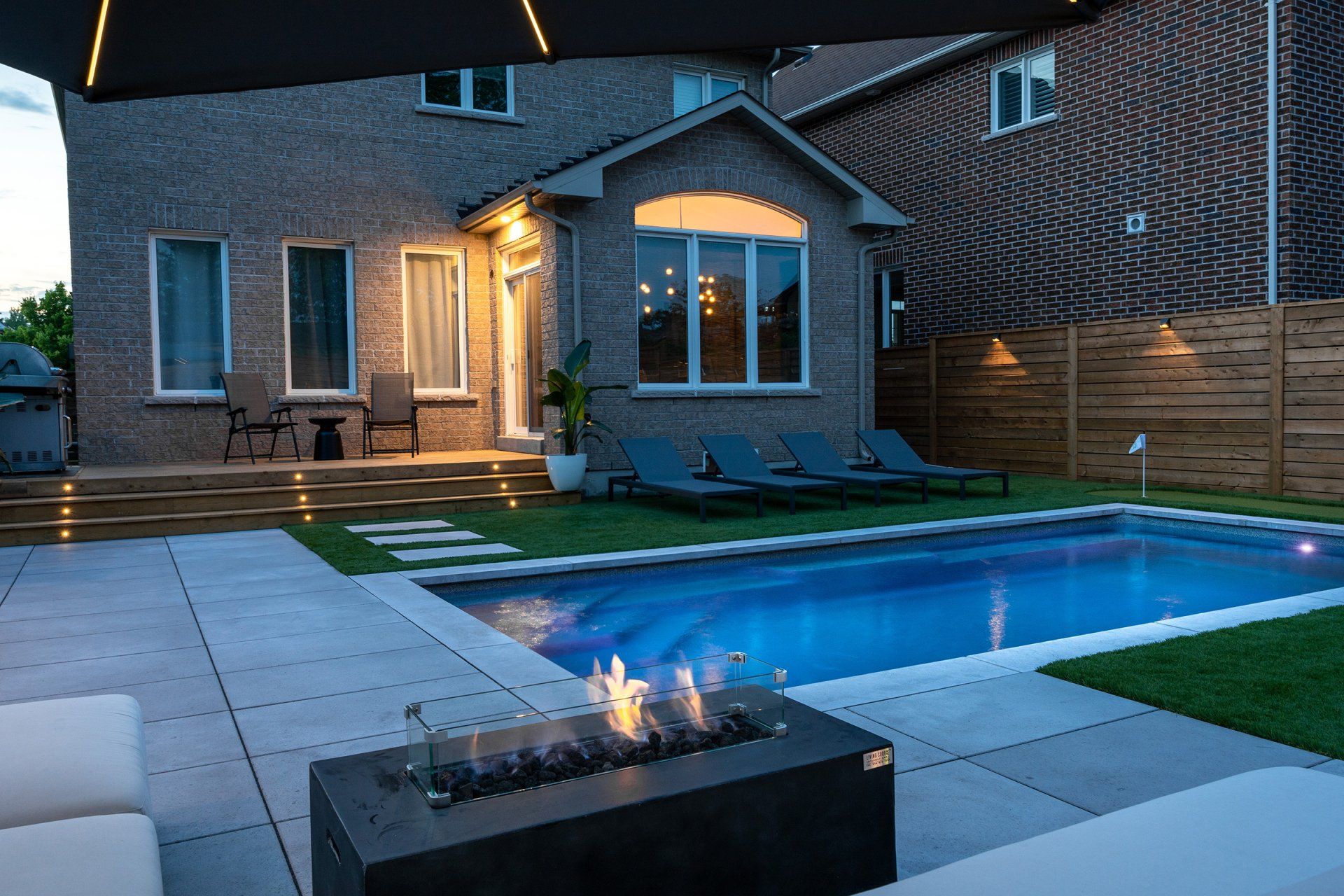 Who says you can't have it all? This space is luxurious, functional, and fun! This project includes a moderately sized Unilock patio, Latham fibreglass pool, artificial turf for the ultimate low-maintenance yard, even a putting green! Gorgeous landscape lighting to truly highlight the stunning features of this backyard oasis.
